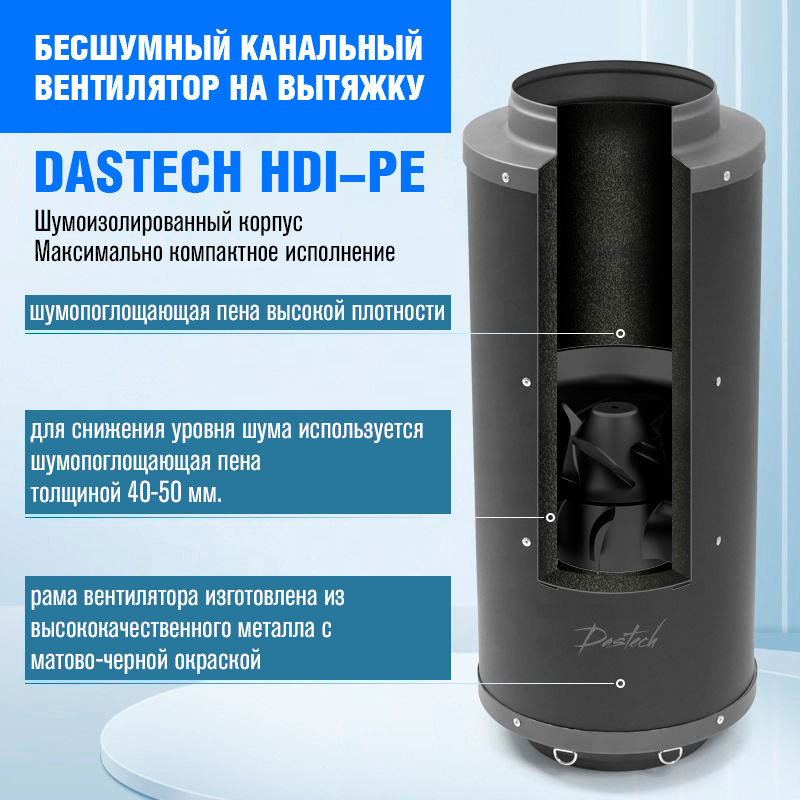 Бесшумный канальный вентилятор Dastech HDI-200PE для вытяжки