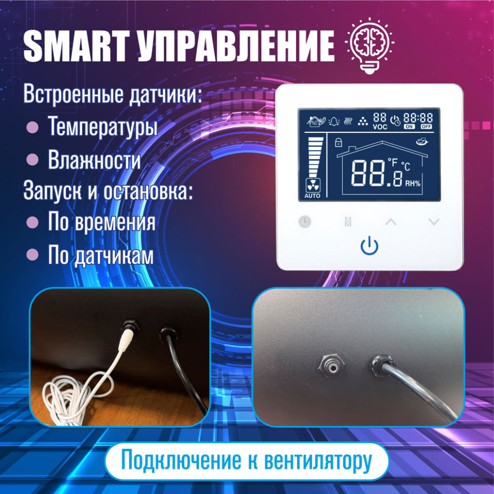 Smart-пульт с дисплеем позволяет плавно регулировать производительность, выбирать режим вытяжки и контролировать работу вентилятора. Для сценариев «бесшумная вентиляция для дома» и «бесшумная вентиляция для офиса» это особенно важно: вентилятор можно настроить на комфортный режим, сохраняя требуемый воздухообмен.